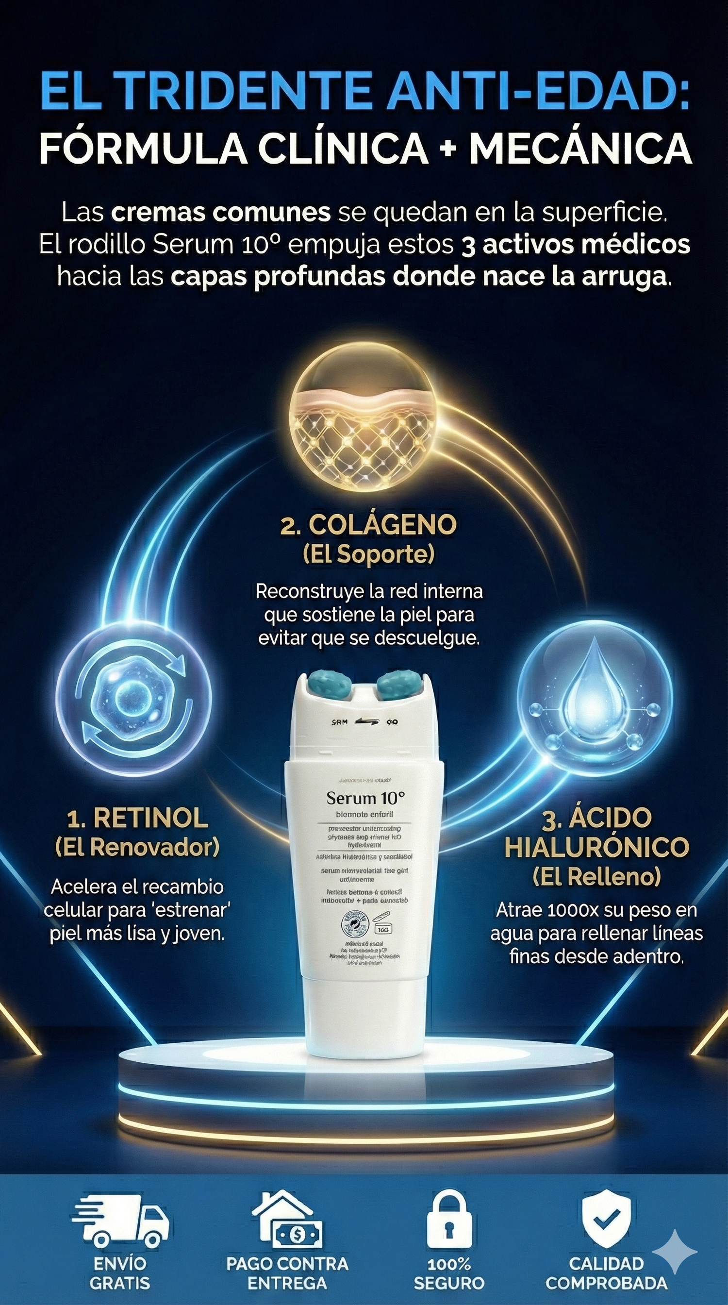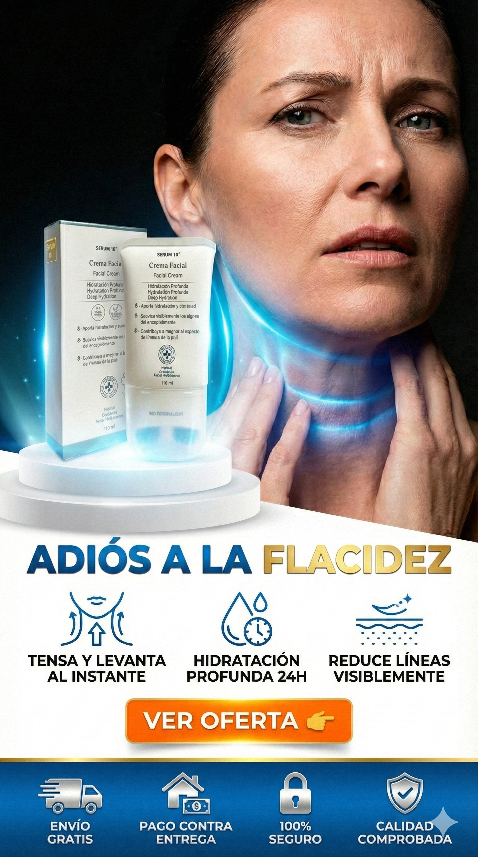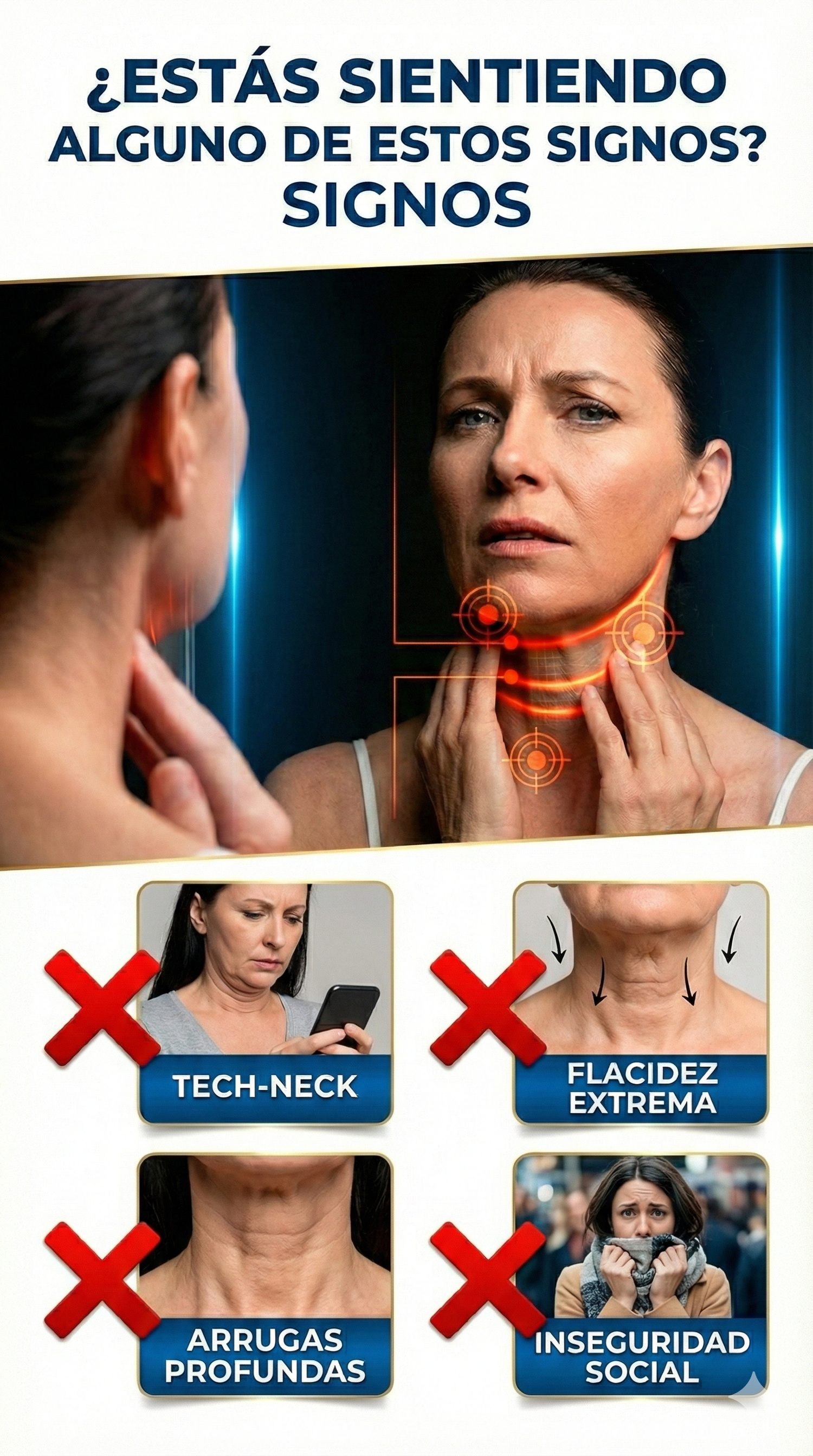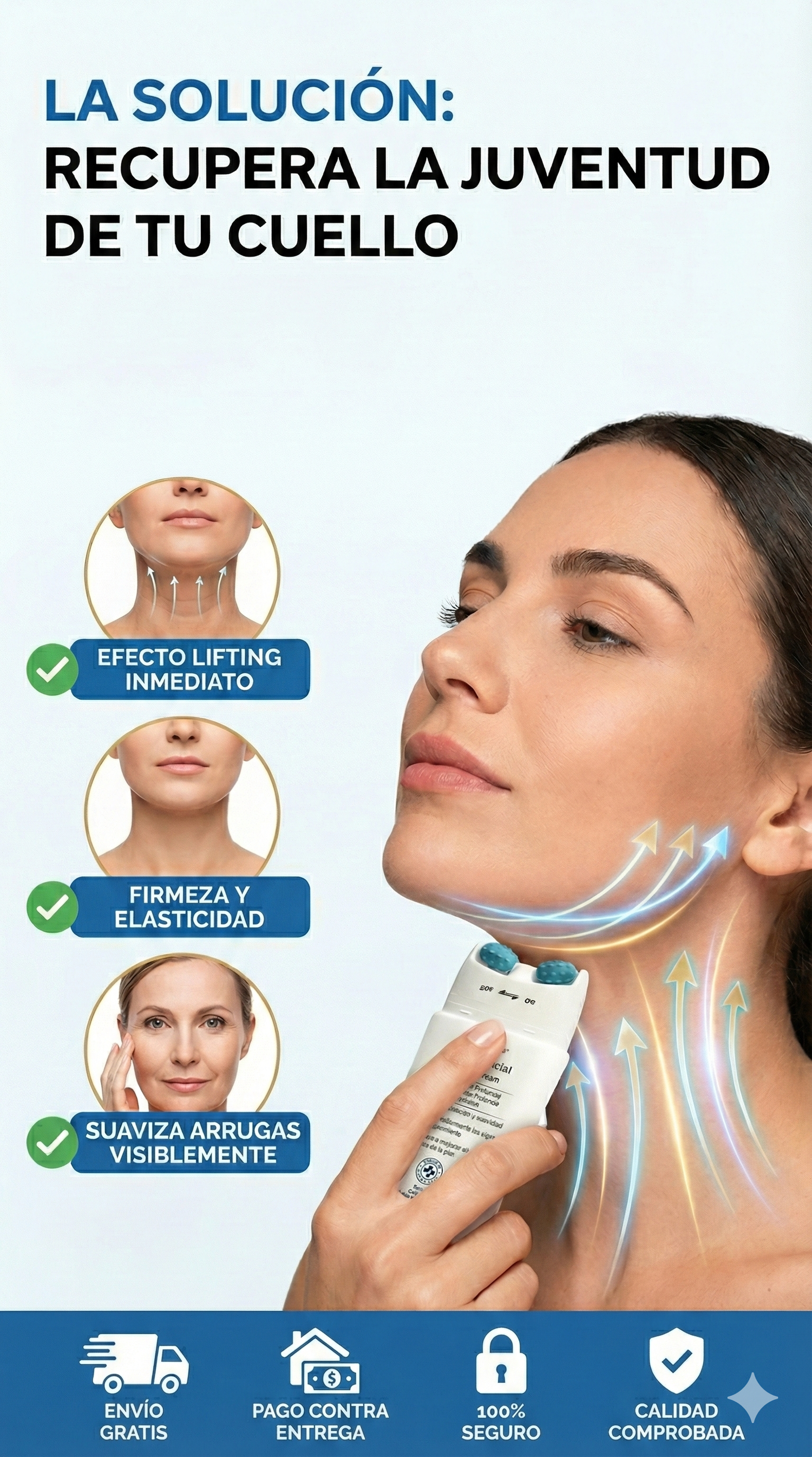 Gira el cabezal a 'ON'. Aplica el serum con movimientos ascendentes de la base del cuello hacia la barbilla, mañana y noche.
